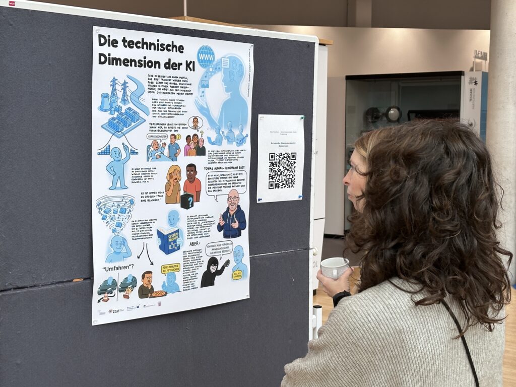 Theorie ist wichtig, doch erst die Praxis macht KI-Kompetenz greifbar. Die Wimmelbilder von Benjamin Bertram visualisierten die fünf Dimensionen der KI-Kompetenz auf kreative Weise. Im Gallery Walk tauschten sich die Teilnehmer*innen über die Inhalte aus – eine spielerische Methode, um komplexe Themen zugänglich zu machen. Die Bilder stehen ebenfalls unter einer Creative-Commons-Lizenz zur freien Nutzung bereit.