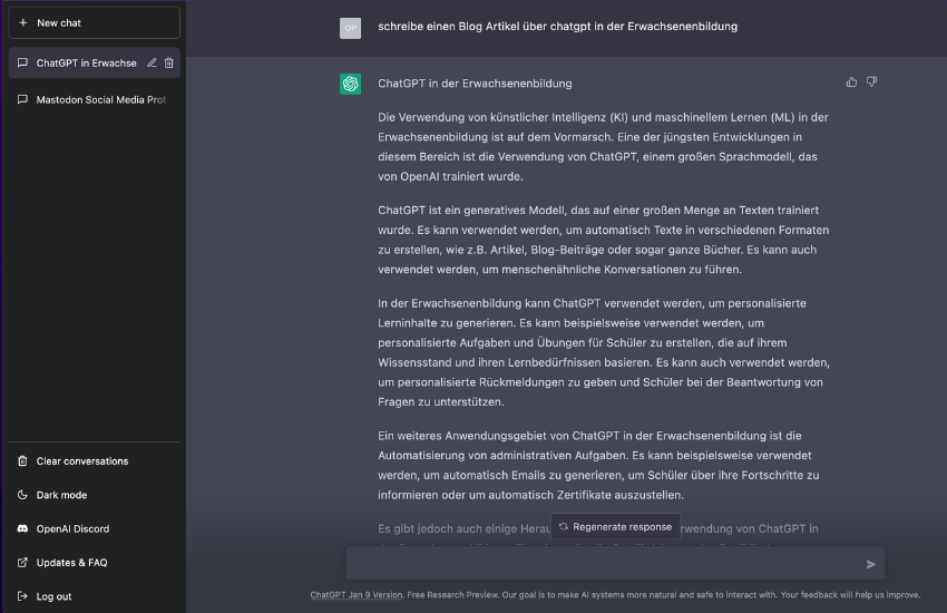 Die Verwendung von künstlicher Intelligenz (KI) und maschinellem Lernen (ML) in der Erwachsenenbildung ist auf dem Vormarsch. Eine der jüngsten Entwicklungen in diesem Bereich ist die Verwendung von ChatGPT, einem großen Sprachmodell, das von OpenAI trainiert wurde und in den letzten Wochen sehr viel Aufmerksamkeit bekommen hat.